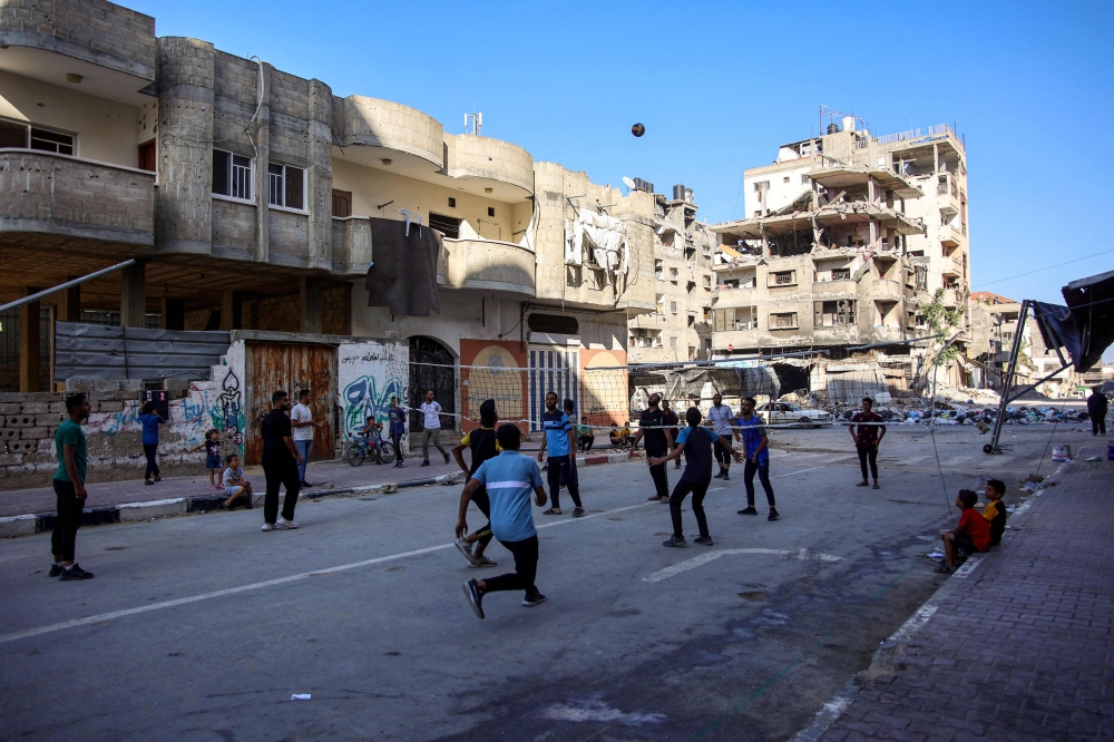 Palestinian youths play volleyball in a street near a building destroyed in Gaza City on June 10, 2024. (Photo by Omar Al-Qattaa / AFP)