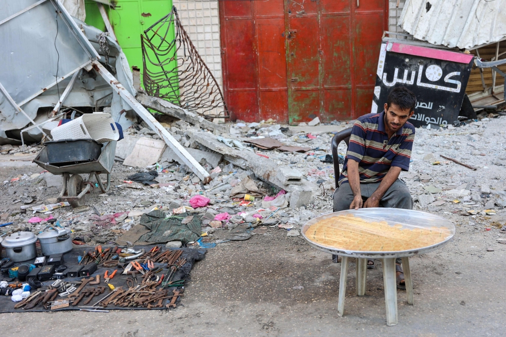 A Palestinian man sells sweets near tools and pots taken from the rubble of buildings for sale, in Gaza City on June 10, 2024. (Photo by Omar Al-Qattaa / AFP)