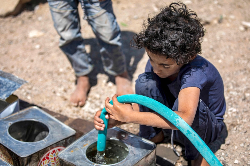 In this picture taken on June 8, 2023, a boy fills up a canister with water from a tanker truck on the outskirts of Yemen's third city of Taez. (Photo by Ahmad Al-Basha / AFP)