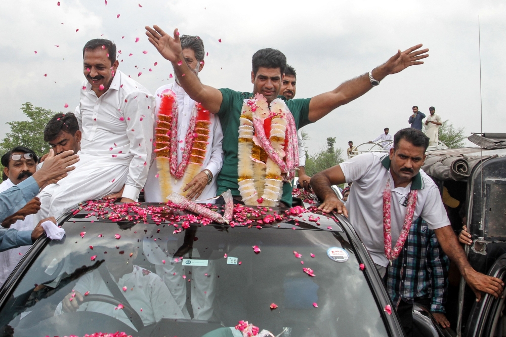Arshad Nadeem (C), Pakistan's javelin gold medallist at the Paris 2024 Olympic Games, waves to fans upon his arrival at hometown in Mian Channu on August 11, 2024. (Photo by AFP)