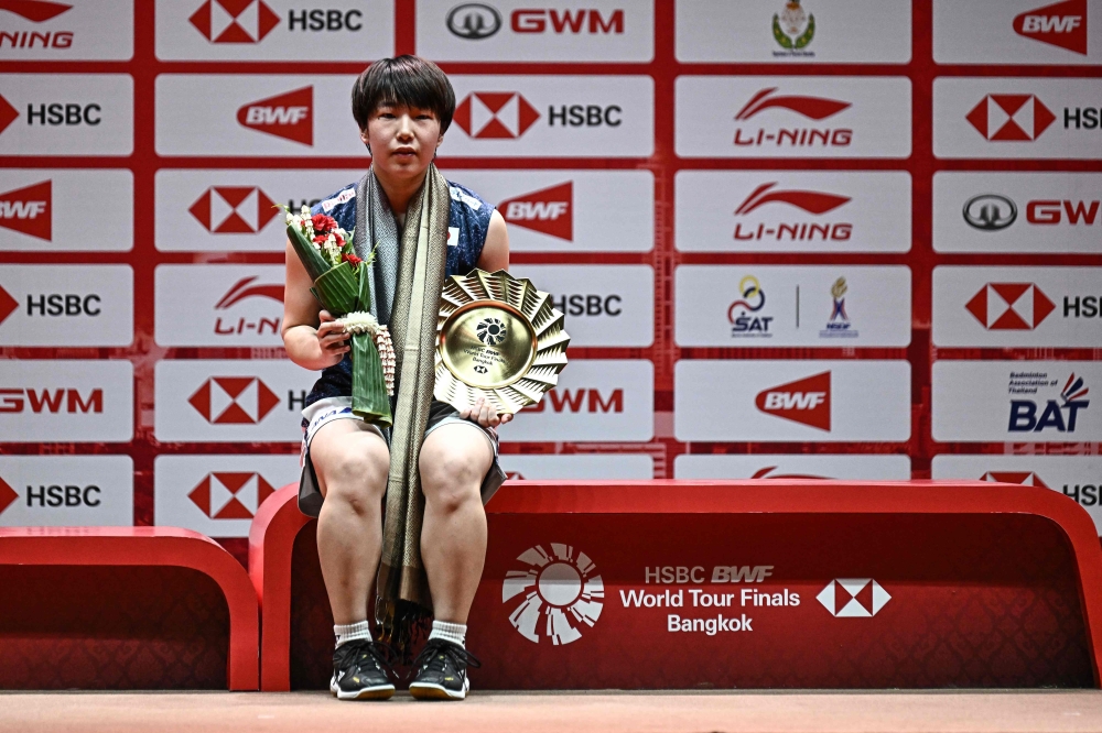 Japan's Akane Yamaguchi holds the winner's trophy after her victory against Taiwan's Tai Tzu-ying in Bangkok on December 11, 2022. (Photo by Lillian Suwanrumpha / AFP)