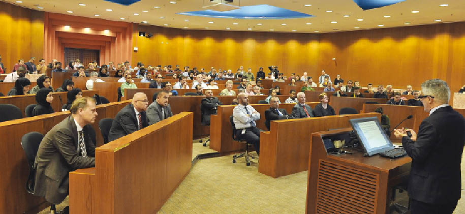 Dr Menachem Elimelech, Director of the Environmental Engineering Programme and the Roberto Goizueta Professor of Environmental and Chemical Engineering at Yale University, delivering a lecture at Texax A&M University at Qatar yesterday. He discussed energy efficiency of desalination and the possible reductions in energy demand by desalination technologies. Pic: Kammutty/The Peninsula