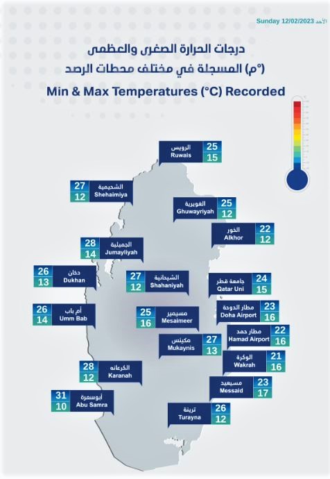 QMD also announced on its social media channels that Abu Samra recorded the lowest temperature for this morning at 10°C, while Doha recorded 16°C.