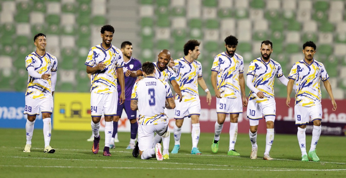 Al Gharafa’s Lyanco celebrates with teammates after scoring the opening goal.