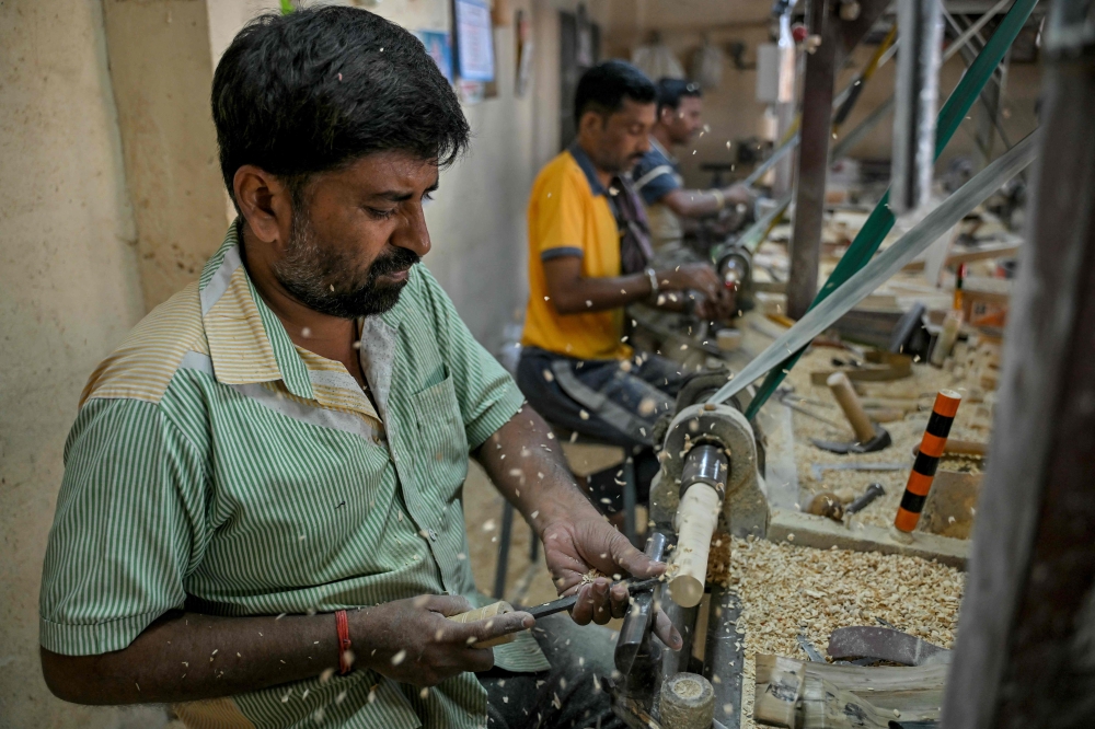 Artisans making wooden toys at a toy manufacturing unit, in Channapatna. (Photo by Idrees Mohammed / AFP)