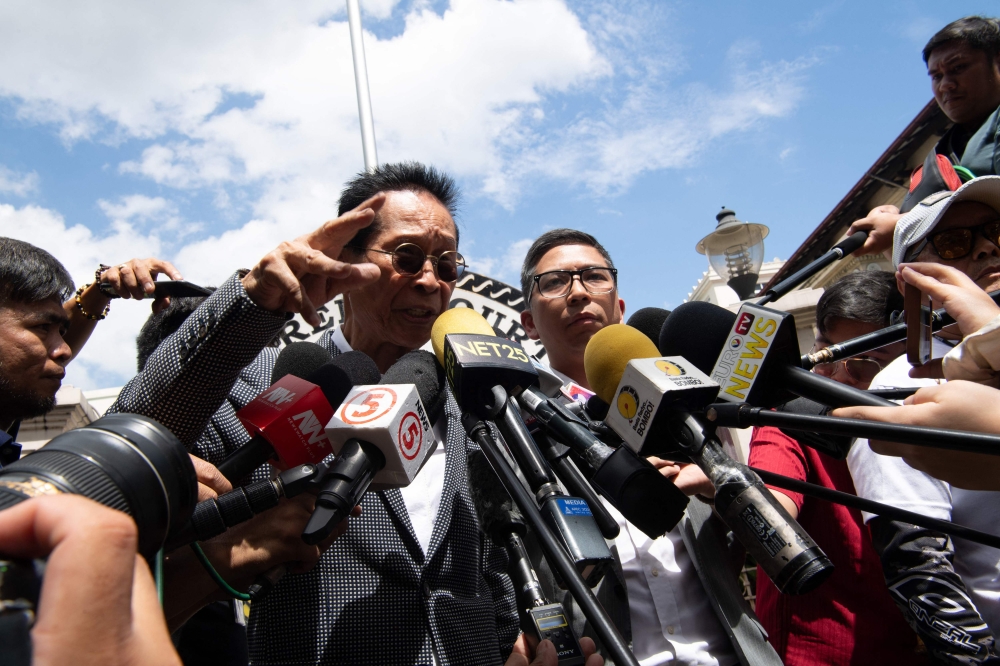 Salvador Panelo (left), lawyer of Philippine former president Rodrigo Duterte, speaks to members of the media after filing Habeas Corpus petition at the Supreme Court in Manila on March 12, 2025. (Photo by Ted Aljibe / AFP)
