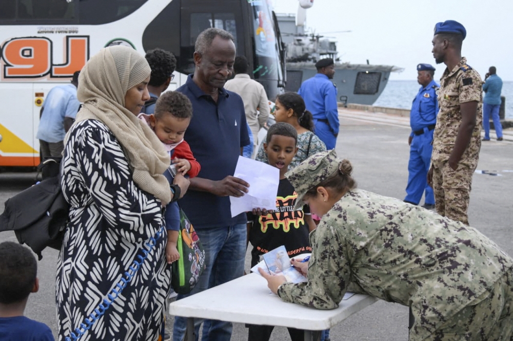 (FILES) A picture taken on April 30, 2023, shows a member of the US military assisting US nationals fleeing war-torn Sudan in boarding an evacuation vessel in Port Sudan, amid the ongoing conflict in Sudan between the army and paramilitaries. (Photo by AFP)