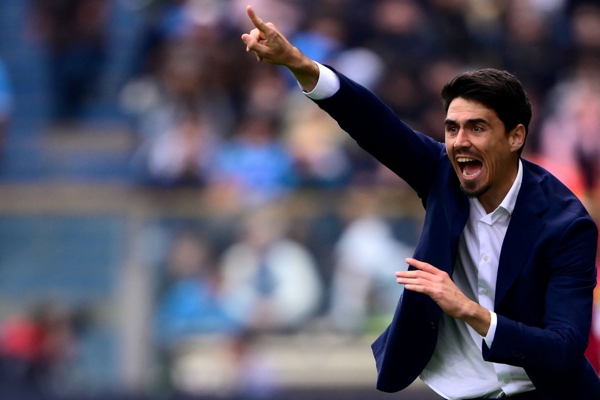 Parma's Spanish coach Carlos Cuesta shouts instructions to his players from the touchline during the Italian Serie A football match between Parma Calcio 1913 and SSC Napoli at the Ennio Tardini Stadium in Parma on April 12, 2026. (Photo by MARCO BERTORELLO / AFP)