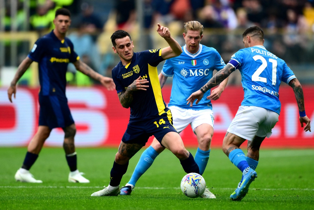 Parma's Italian defender #14 Emanuele Valeri (L) fights for the ball with Napoli痴 Belgian midfielder #11 Kevin De Bruyne (C) and Napoli痴 Italian forward #21 Matteo Politano (R) during the Italian Serie A football match between Parma Calcio 1913 and SSC Napoli at the Ennio Tardini Stadium in Parma on April 12, 2026. (Photo by MARCO BERTORELLO / AFP)