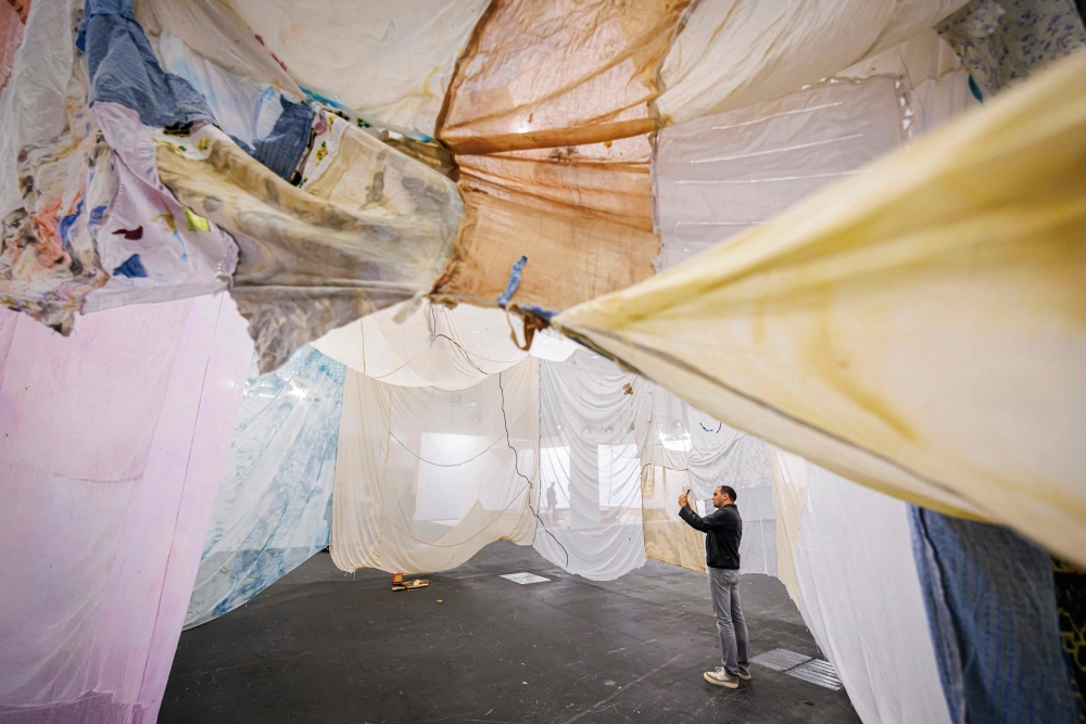 A visitor takes a picture of "Zustand Hand" 2024, by Swiss artist Reto Pulfer displayed at the Unlimited sector of Art Basel fair for Modern and contemporary art, in Basel, northern Switzerland, on June 11, 2024. (Photo by Valentin FLAURAUD / AFP)
