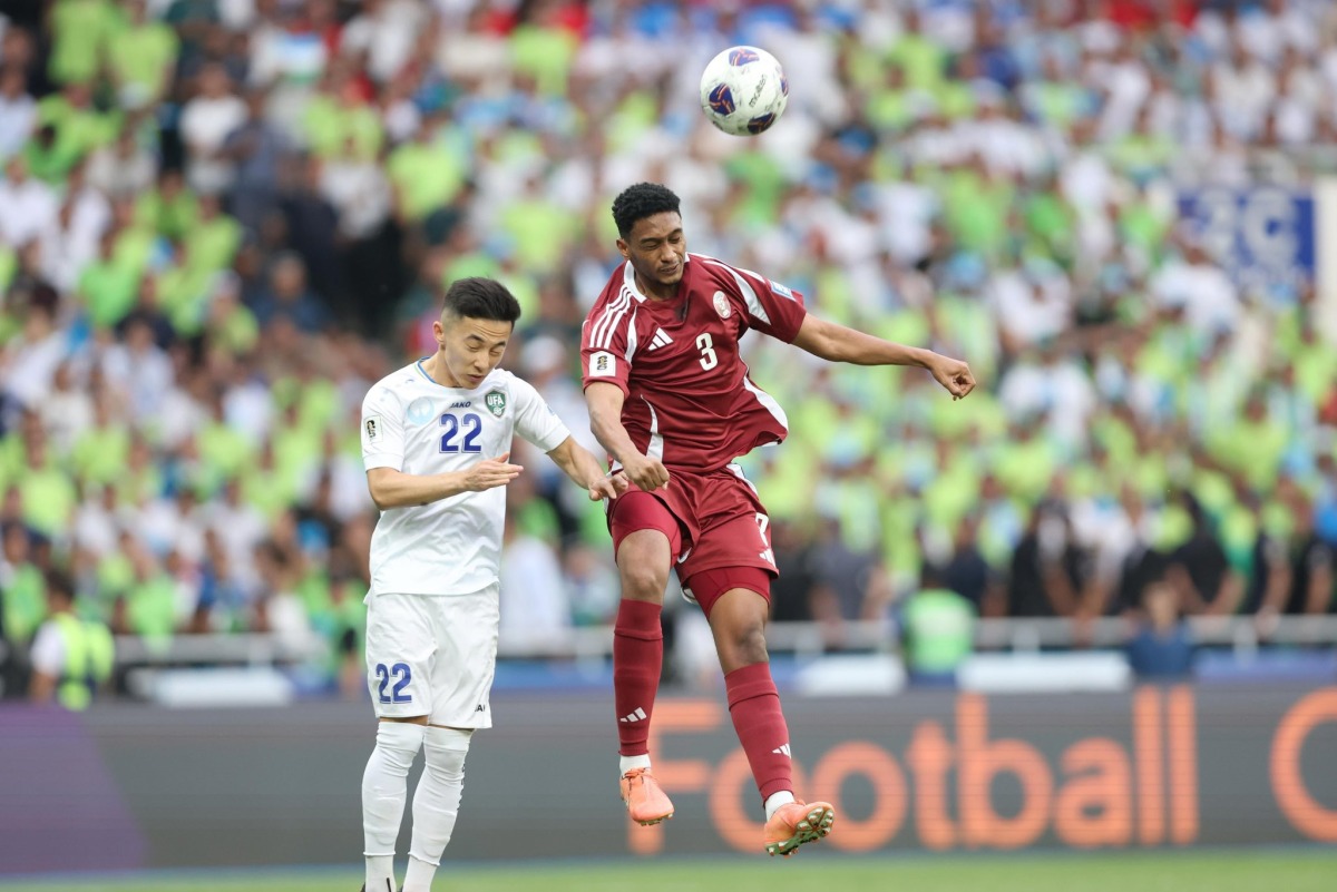 Qatar defender Abdullah Youssef (right) vies for the ball with Uzbekistan’s Abbosbek Fayzullaev.
