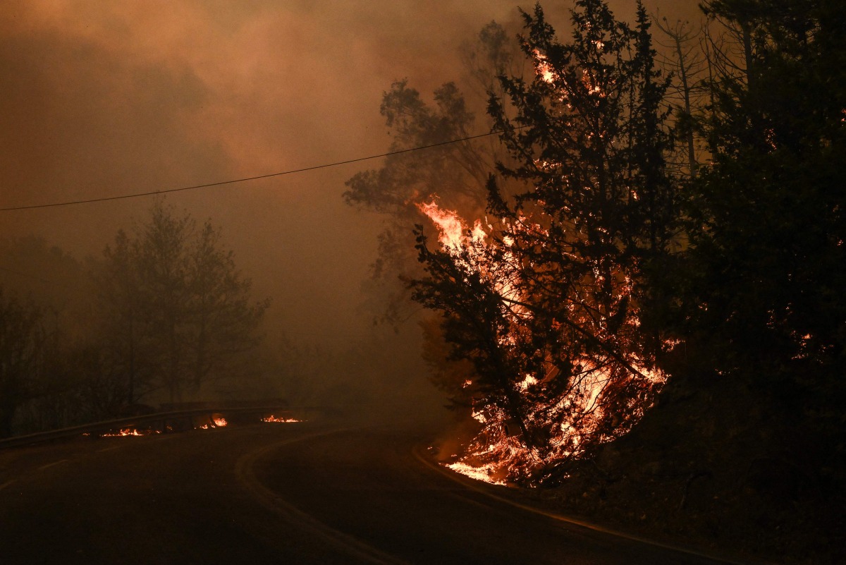 A wildfire burns vegetation along a road during a wildfire in Varnavas, north of Athens, on August 11, 2024. (Photo by Angelos TZORTZINIS / AFP)
