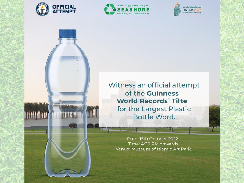 Another exciting activity is set to take place at the MIA Park on Saturday as part of Qatar Sustainability Week. Everyone is invited to support Qatar's attempt to break the Guinness World Records Title for the Largest Plastic Bottle Word currently owned by Saudi Arabia's Al-Ettifaq Club. Join Seashore Recycling and Sustainability in creating something officially amazing out of used plastic bottles!