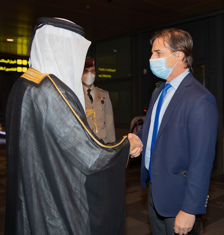 His Excellency and the accompanying delegation were welcomed upon arrival at the Hamad International Airport by HE Minister of State Dr. Hamad bin Abdulaziz Al Kuwari, Acting Charge d'Affairs at the Embassy of the State of Qatar to the Oriental Republic of Uruguay Taleb Mohamed Al Menakhas and HE Ambassador of the Oriental Republic of Uruguay to the State of Qatar Dr. Jorge Antonio Sere Sturzenegger.