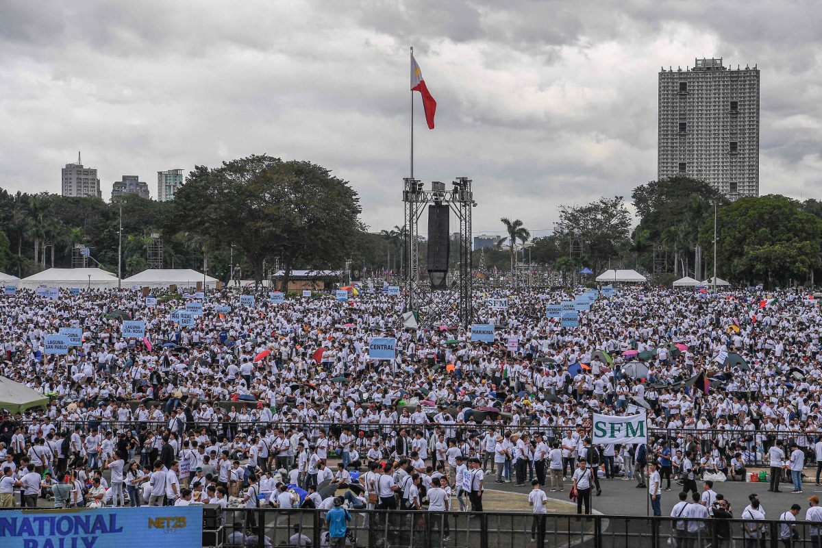 Crowds wearing white shirts flocked to Manila's Quirino Grandstand for the "national rally for peace", organised by the conservative Iglesia ni Cristo (INC), or Church of Christ.