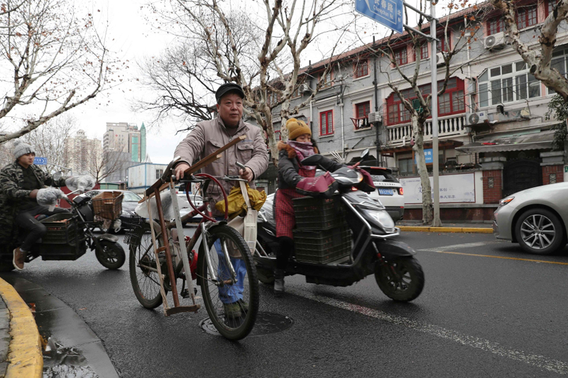 This file photo taken on January 31, 2019 shows carpenter Ma Jiale pushing his bicycle between jobs in Shanghai.