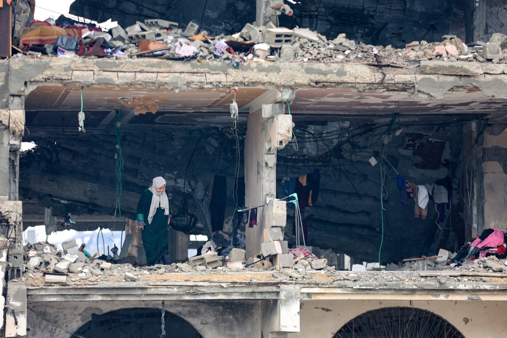 A Palestinian woman stands inside a heavily damaged building in Beit Hanun in the northern Gaza Strip on February 12, 2025. (Photo by Omar Al-Qattaa / AFP)
