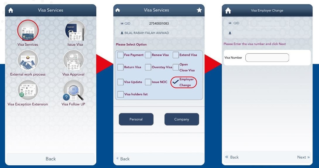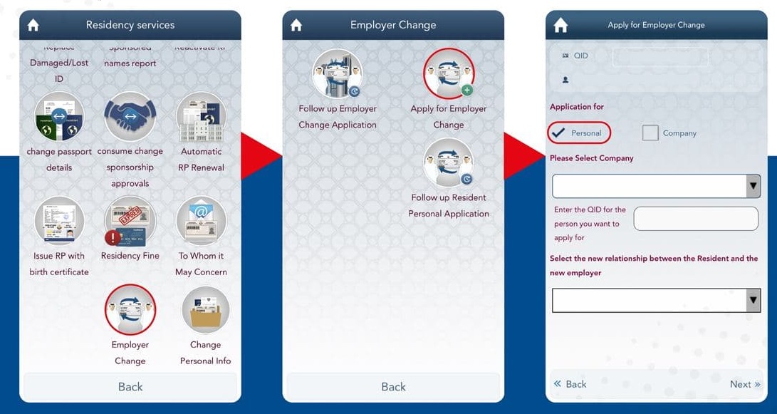 Service for Changing Personal Employer and those on similar status (Farms, Fishing Boats): 'Residency Services' window on Metrash2 allows you to access and complete the 'Employer Change' service. This service is available for personal employers and those on their status, such as owners of farms and fishing boats. The new employer has to submit the application for employer change and attach the required documents. The application will be referred to the Review Committee electronically for their decision.