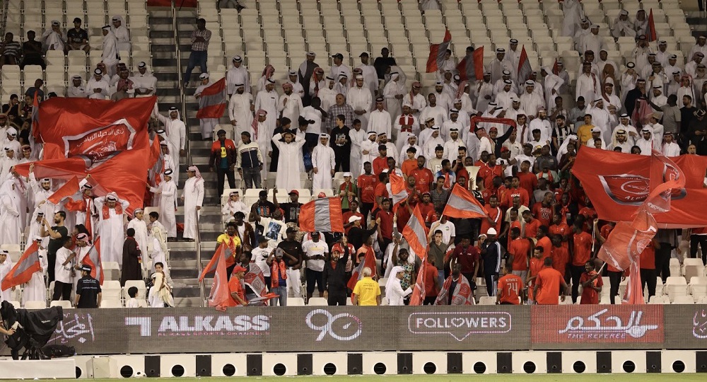 Al Duhail fans celebrate as Al Sadd fans look dejected after the visitors equalised in the stoppage time.