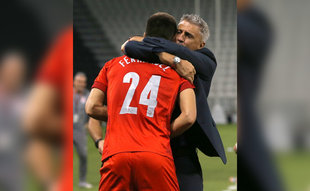 Al Duhail coach Hernan Crespo embraces Federico Fernandez after the match.