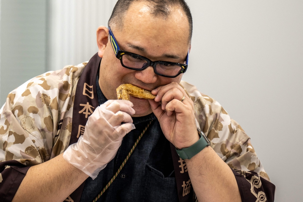 This picture taken on March 4, 2023 shows Japan Karaage Assosiation executive director Kouichirou Yagi eating a chicken wing during the Karaage Grand Prix competition in Tokyo.