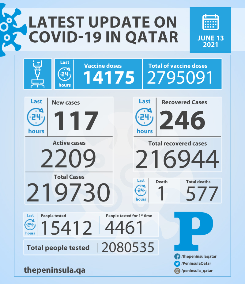 Doha: Ministry of Public Health (MoPH) today reported 117 new cases of coronavirus (Covid-19) and 246 people recovered from the virus in the last 24 hours, bringing the total number of people recovered in Qatar to 216,944.