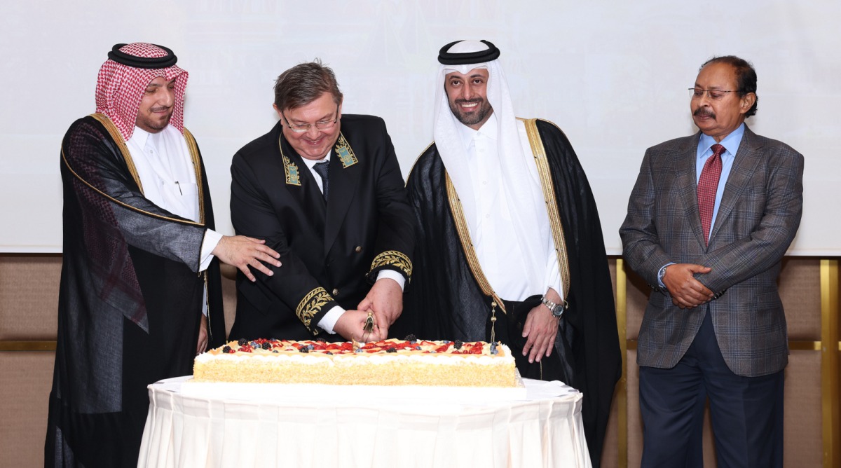 Minister of Municipality H E Abdullah bin Hamad bin Abdullah Al Attiyah, Ambassador of Russia to Qatar H E Dmitry Dogadkin, Director of the Protocol Department at the Ministry of Foreign Affairs H E Ibrahim Yousif Abdullah Fakhro, Dean of the Diplomatic Corps H E Ali Ibrahim Ahmed cutting a cake to mark the National Day of Russian Federation at a reception hosted by the envoy yesterday.
