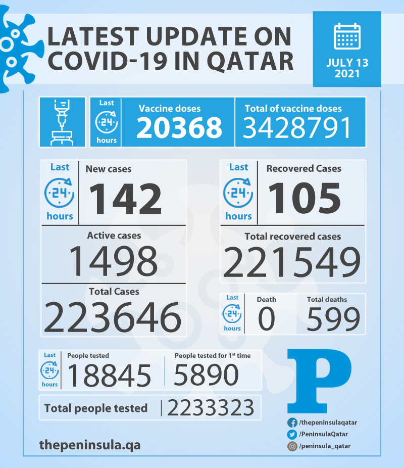 The total number of positive Covid-19 cases recorded in Qatar till now is 223,646 and there are 1,498 active cases under treatment.