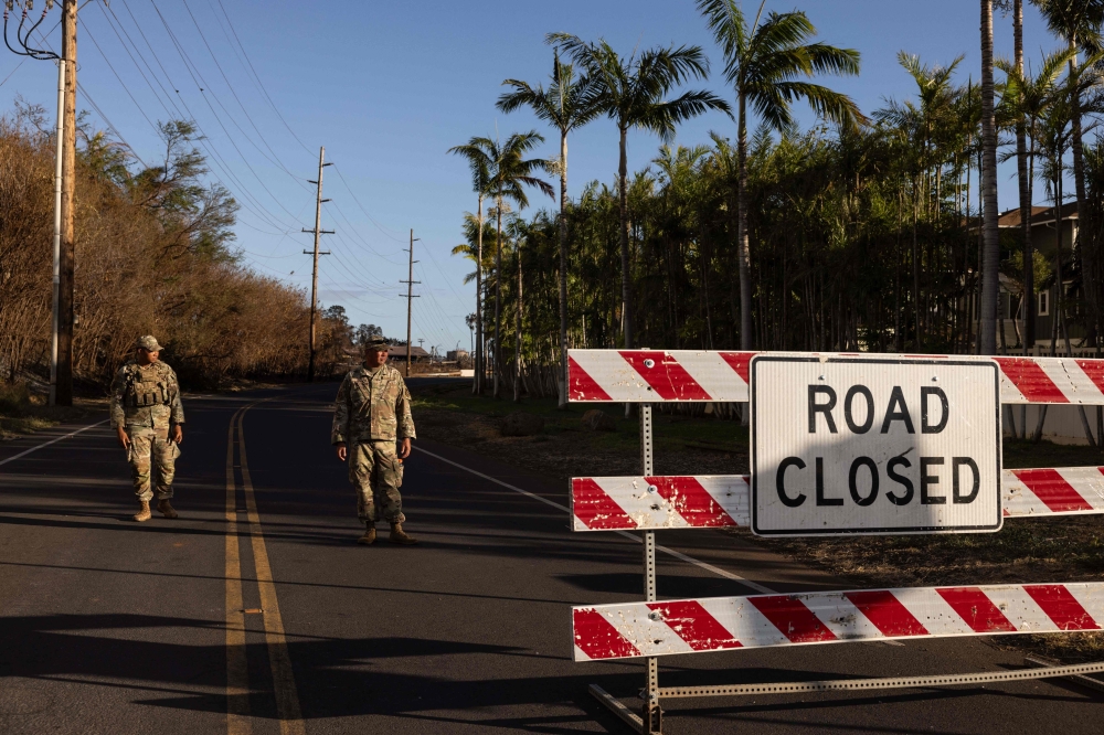 Members of the US National Guard stand on a closed road in Lahaina, western Maui, Hawaii on August 12, 2023.