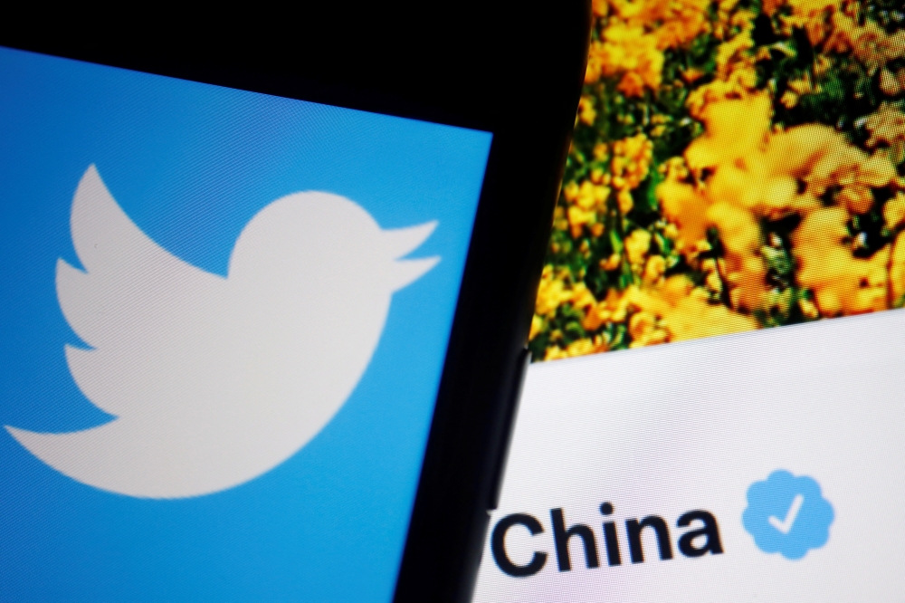 A Twitter logo is displayed on a mobile phone in front of a verified account operated by People's Daily, a Chinese state media, in this illustration picture taken on September 8, 2022. (REUTERS/Florence Lo)