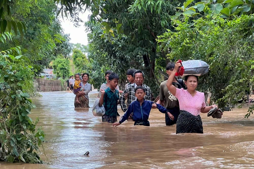 Residents walk through flood waters in Sin Thay village in Pyinmana, in Myanmar's Naypyidaw region, on September 13, 2024, following heavy rains in the aftermath of Typhoon Yagi. (Photo by Sai Aung Main / AFP)