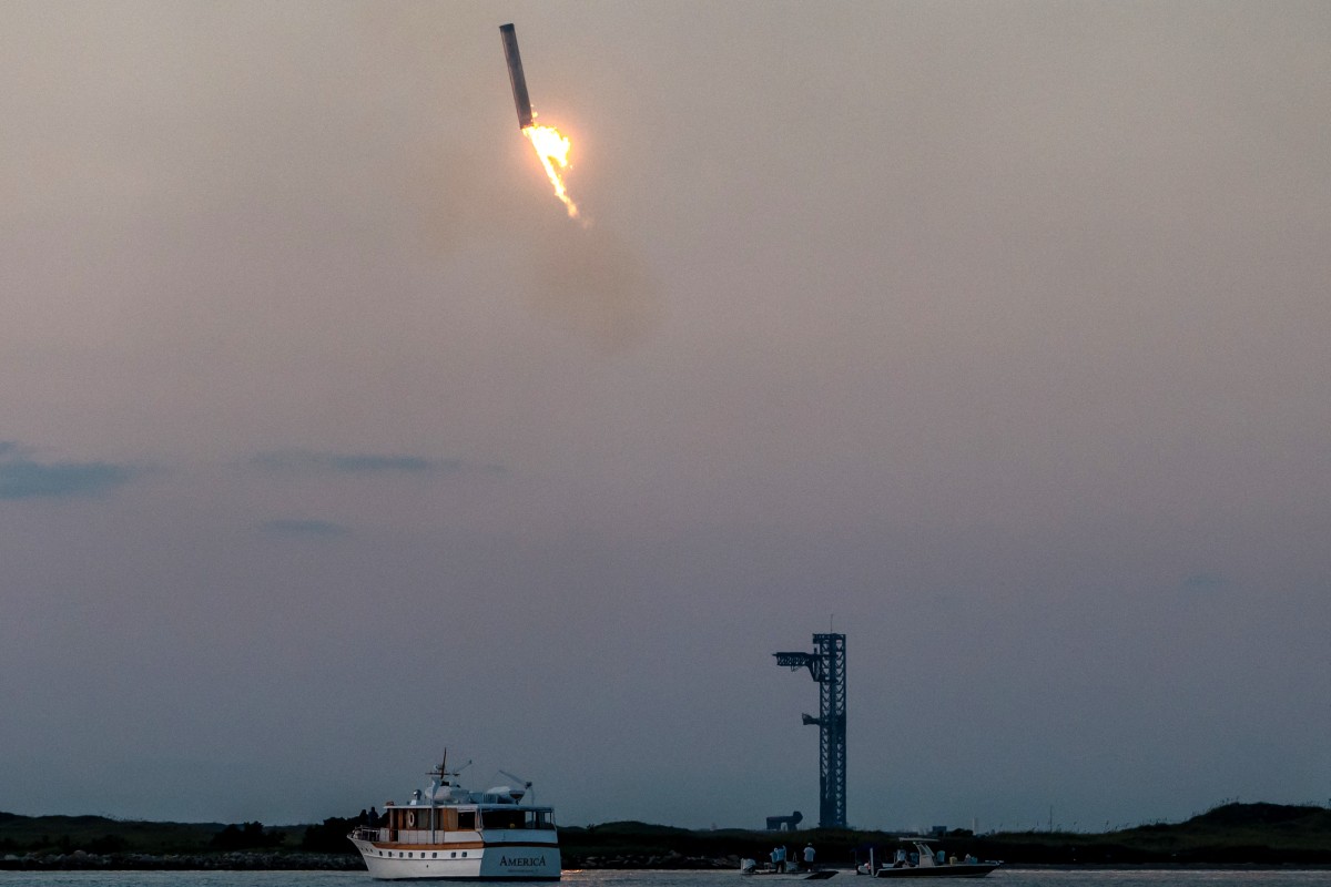 Starship's Super Heavy Booster comes in for a "landing" at the launch pad in Starbase near Boca Chica, Texas, on October 13, 2024. Photo by SERGIO FLORES / AFP.