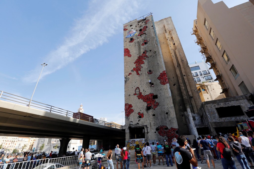 People taking part in the competition, held in the Bishara El Khouri region of the capital Beirut, try to climb the entire wall using holes created in the conflict in Beirut.