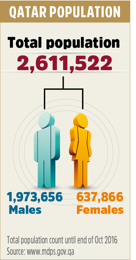 The latest data comprises 1,973,656 males and 637,866 females including Qataris and non-Qataris within Qatar. Those who were outside Qatar on October 31, 2016 are not included in the figure.