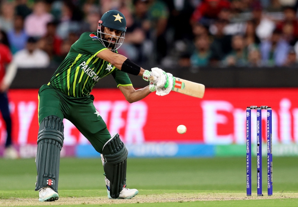 Pakistan's Shan Masood plays a shot during the ICC men's Twenty20 World Cup 2022 cricket final match between England and Pakistan at the Melbourne Cricket Ground (MCG) in Melbourn on November 13, 2022. (AFP/Martin Keep)
