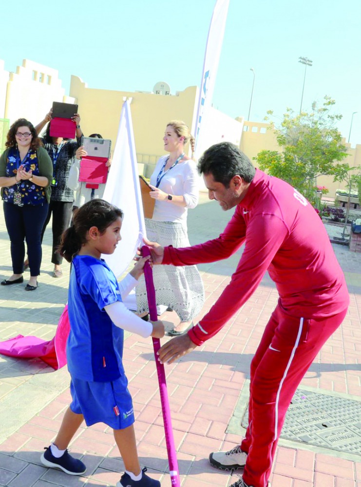 Qatar’s three-time Dakar Rally champion Nasser Al Attiyah handing over a flag to a student during an event held at Doha College yesterday to celebrate the Flag Relay.