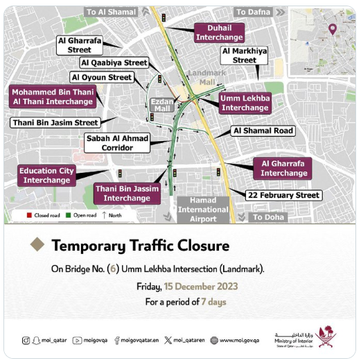 "Please pay attention to the temporary road closure on Bridge No. (6) at the Umm Lekhba interchange (Landmark) starting from Friday, 15 December 2023, for a duration of 7 days. Kindly follow the road signs and adhere to traffic regulations. Drive safely," said MoI's announcement on its social media handles.