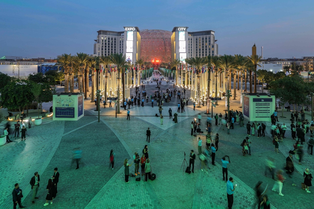 People walk outside Expo City in Dubai on December 12, 2023 during the United Nations Climate Change Conference COP28. (Photo by Giuseppe CACACE / AFP)