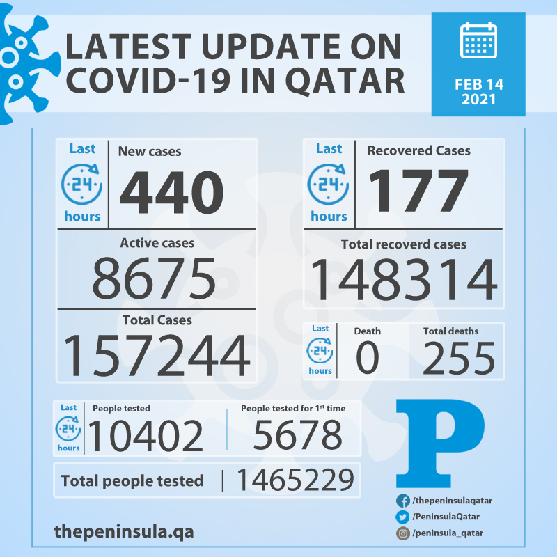 Doha: Ministry of Public Health (MoPH) today reported 440 new cases of coronavirus (Covid-19) and 177 people recovered from the virus in the last 24 hours, bringing the total number of people recovered in Qatar to 148,314.