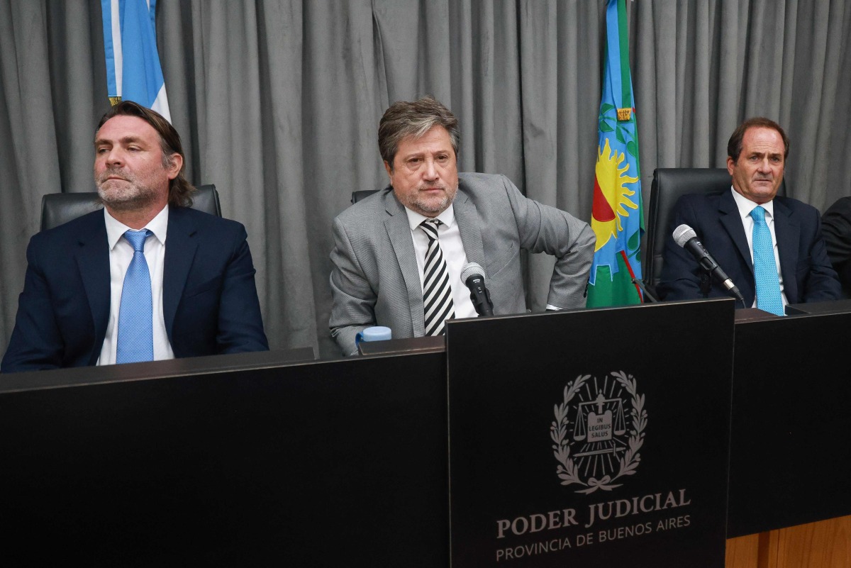 Judges Alberto Ortolani (L), Alberto Gaig (C) and Pablo Rolon (L) are seen at a courthouse during a preliminary hearing in a trial over Argentine football legend Diego Maradona's death in San Isidro, outskirts of Buenos Aires on April 14, 2026. (Photo by Tomas CUESTA / AFP)