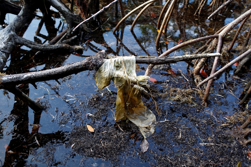 The remains of a plastic bag are seen in the mangroves at Crandon Park in Miami, Florida, US, July 13, 2022. (REUTERS/Marco Bello)