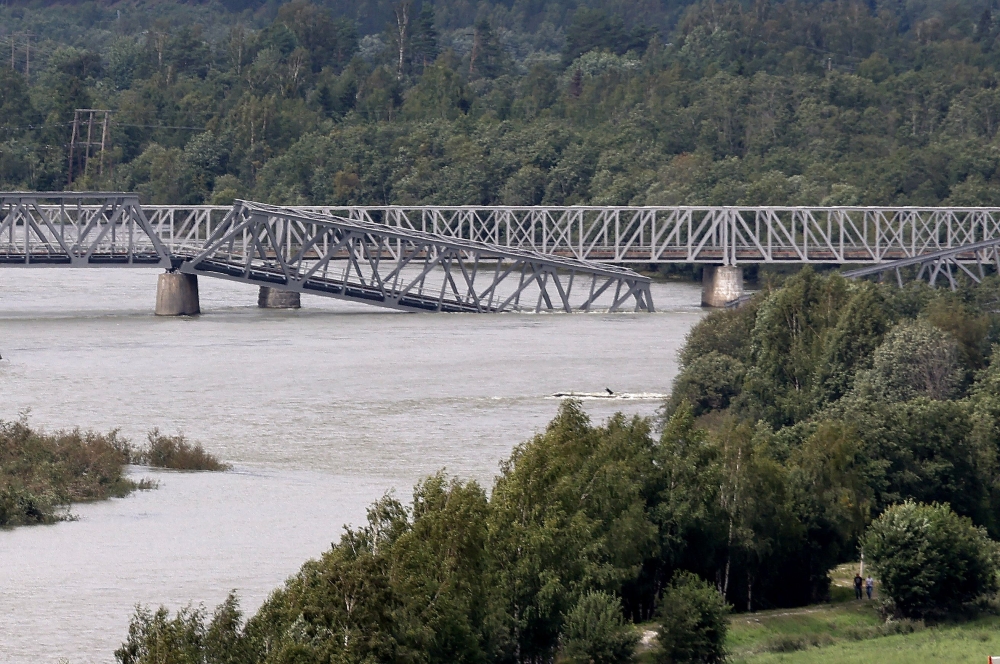 A photo taken on August 14, 2023 shows the railway bridge over the Gudbrandsdalslagen river in Ringebu, Norway after the bridge collapsed. Photo by Lars SKJEGGESTAD KLEVEN / NTB / AFP