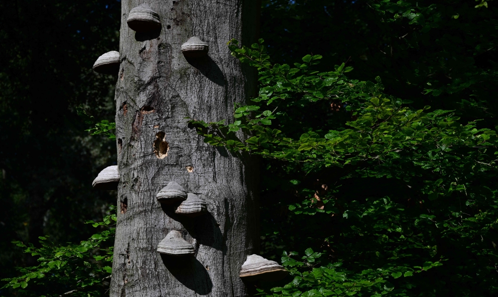 Tinder fungus is seen at the torso of a beech tree. (Photo by Tobias Schwarz / AFP)
