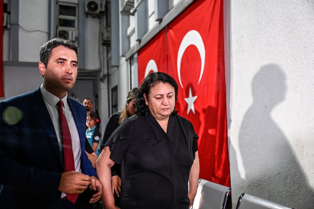 Rabia Birden (C) mother of US-Turkish activist Aysenur Ezgi Eygi looks on as she attends the arrival of her daughter's coffin at a morgue on September 13, 2024.