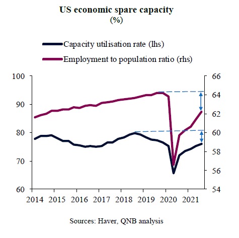 First, there is still significant “slack” or spare capacity in the US economy, which suggests that supply constraints should be temporary. The “slack,” or negative output gap, means that current levels of production and employment are below capacity or labour availability. In fact, total industrial capacity utilization and the employment-to-population ratio are both still significantly below their pre-pandemic levels. Hence, there is still some room for additional manufacturing demand and employment growth before the economy start to overheat to the point of creating permanent inflationary pressures.