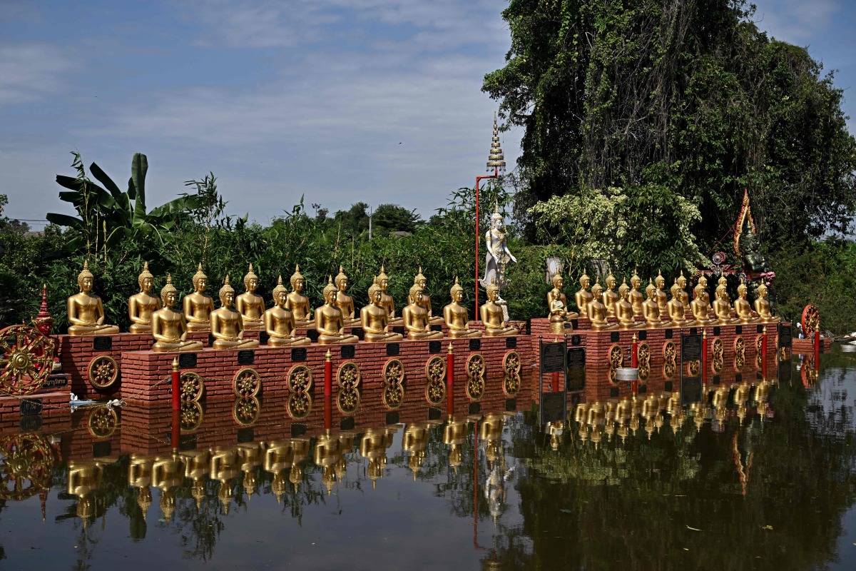 Buddha statues are pictured above flood waters at Wat Choeng Tha Buddhist temple in Ayutthaya on November 14, 2025. (Photo by Lillian SUWANRUMPHA / AFP)