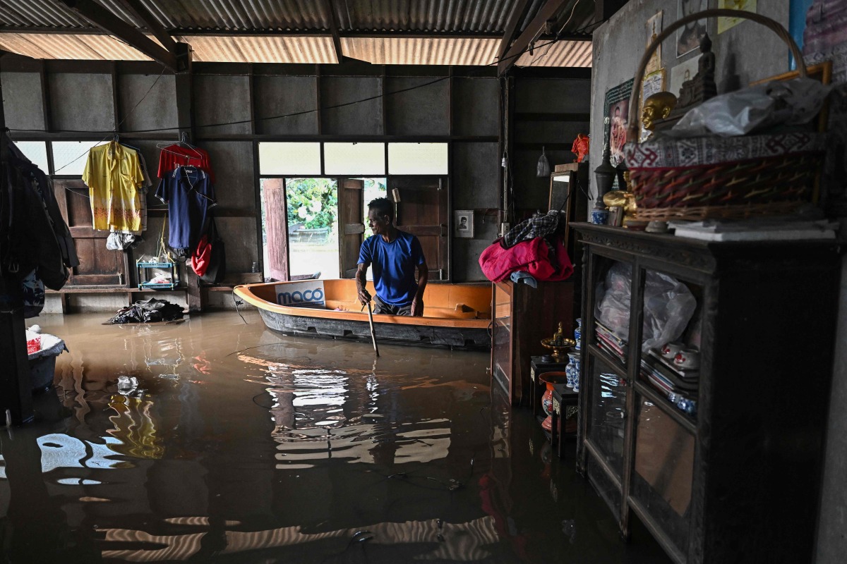 Thai retiree Somkid Kijniyom, 69, sits on a boat inside his flooded home in Bang Ban district in the central Thai province of Ayutthaya on November 14, 2025. (Photo by Lillian SUWANRUMPHA / AFP)