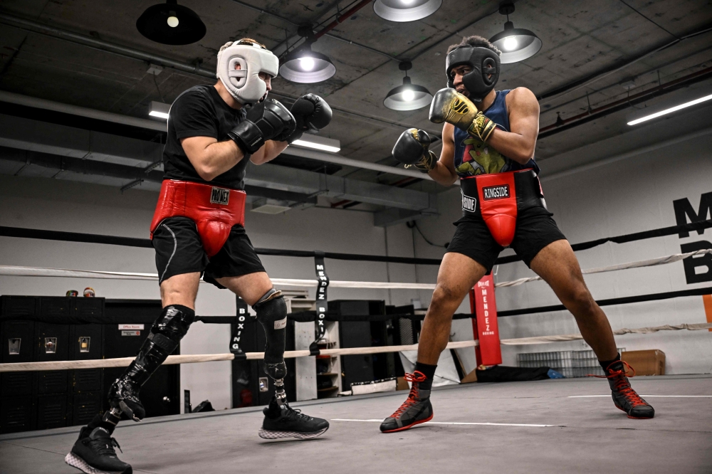 Boxer Pierre-Mickaël Hugues (L) trains at Mendez Boxing Gym- Harlem on December 5, 2024 in New York City. (Photo by Angela Weiss / AFP)