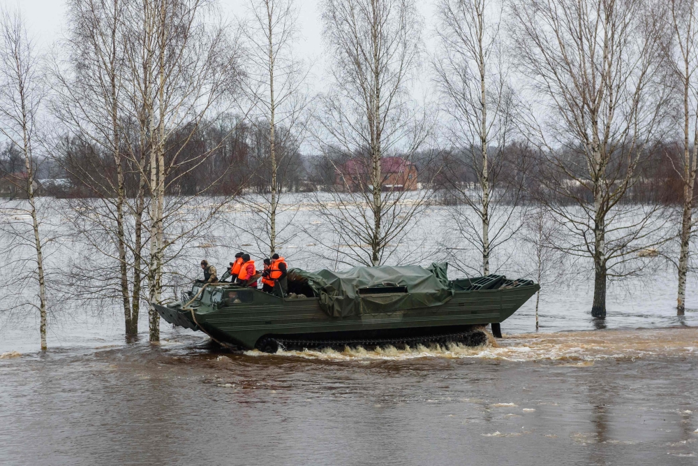 Soldiers on a Military amphibia make their way through flooded areas in Jekabpils, Latvia, on January 15, 2023. (Photo by Gints Ivuskans / AFP)