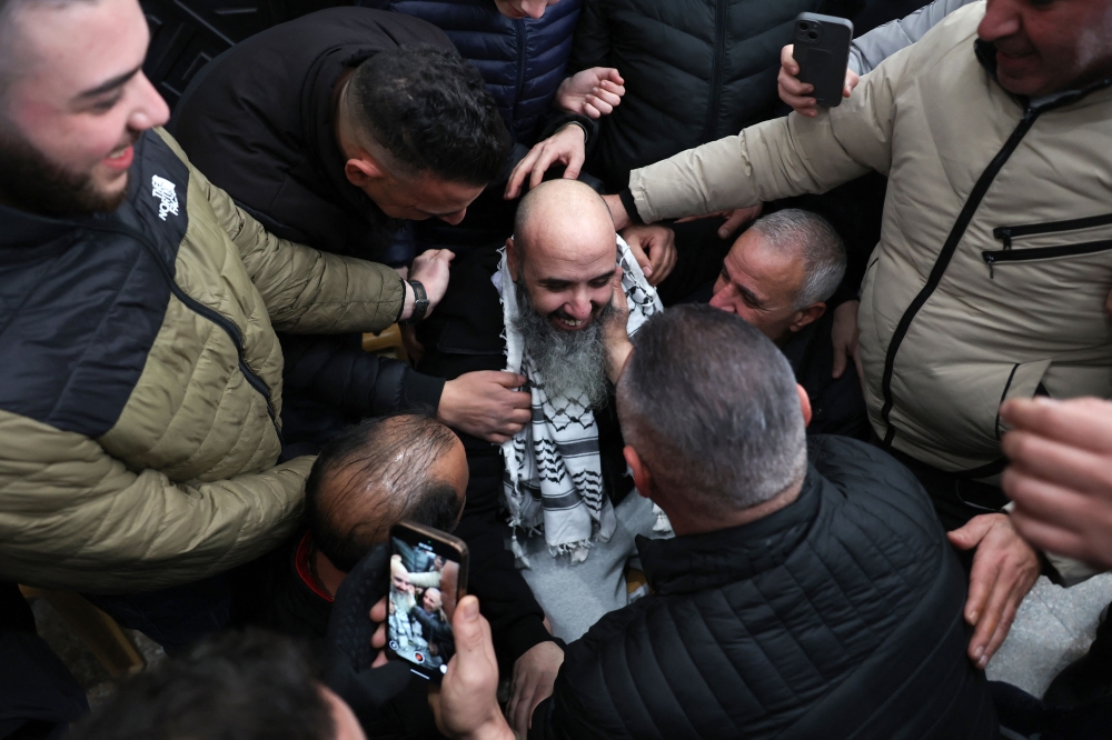 A former Palestinian prisoner is welcomed by relatives upon arriving in the occupied West Bank city of Ramallah on February 15, 2025. (Photo by Zain Jaafar / AFP)